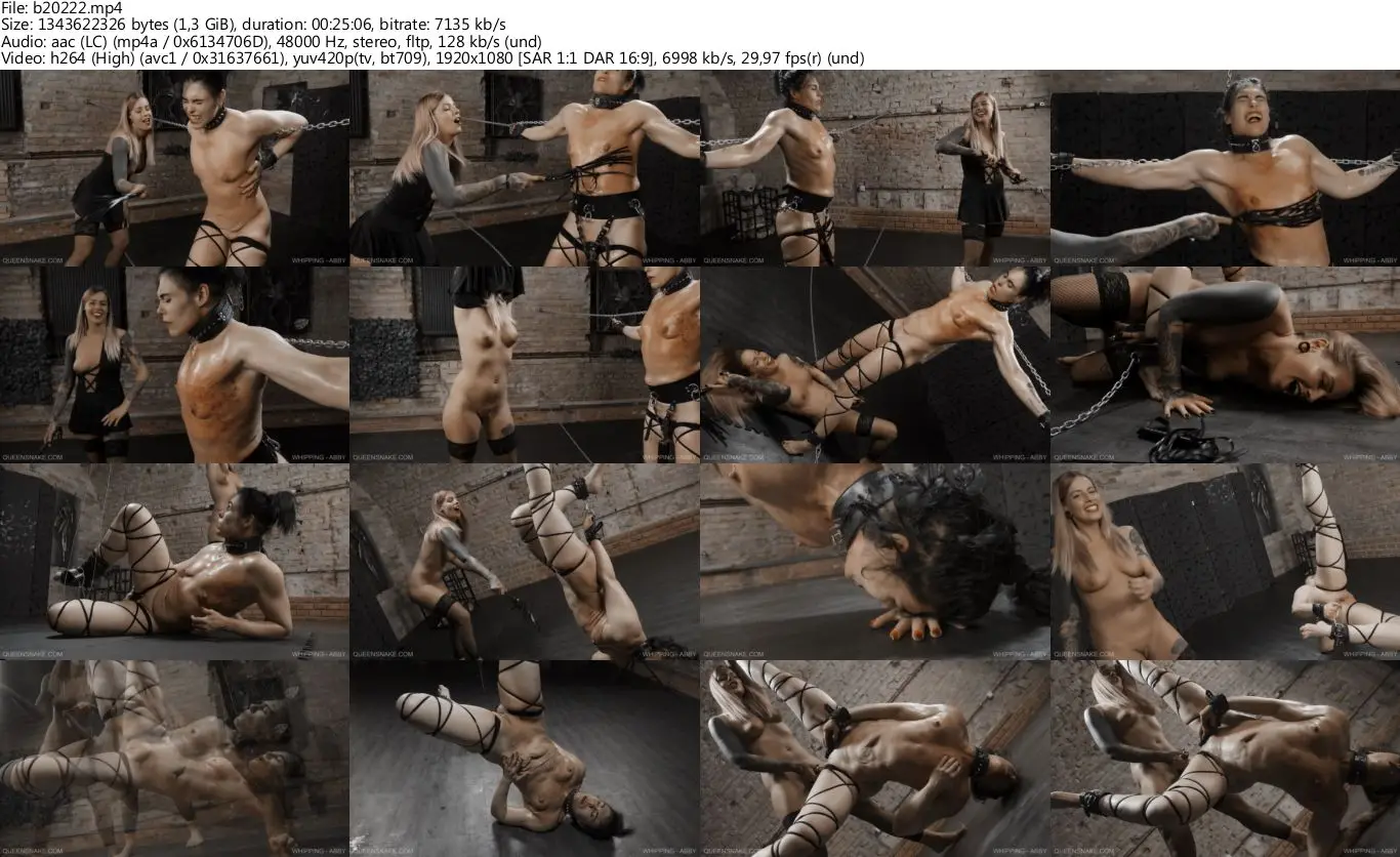 Abby is a hyperactive sub so she needs to be tied up securely otherwise she squirms and wriggles around until she escapes. This is a simple full body whipping session of Abby. Jessica used a light flogger on her tits then she whipped her pussy in a sideways suspended pose until it became numb.